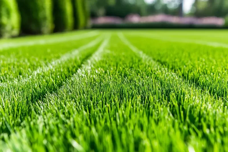 Close-up view of well-maintained green grass lawn with yard lines, likely a sports field, with trees and partially visible pink flowers in the background.